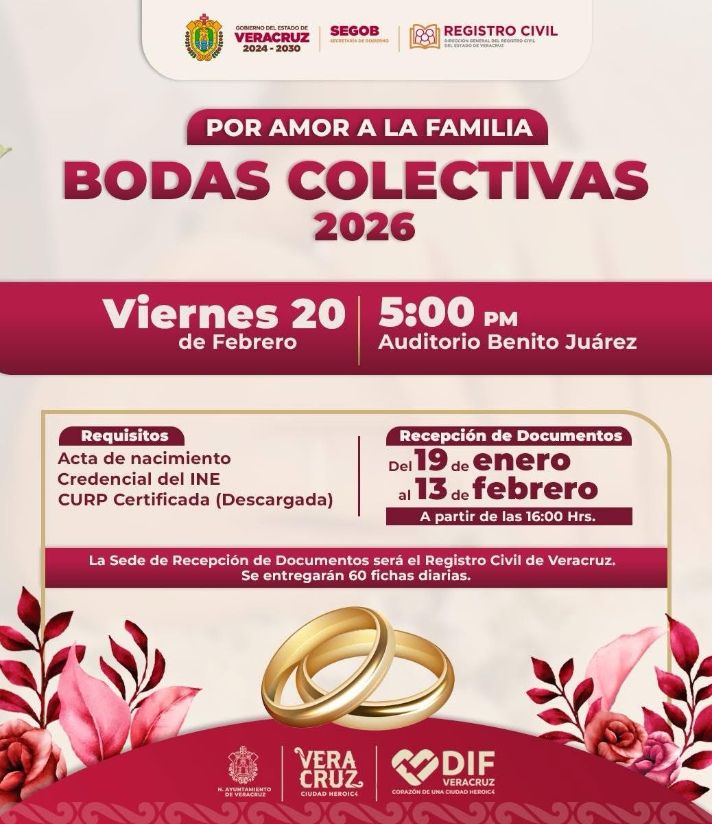 El Ayuntamiento de Veracruz abrió la convocatoria para las Bodas Colectivas 2026 “Por amor a la familia”. El registro será…